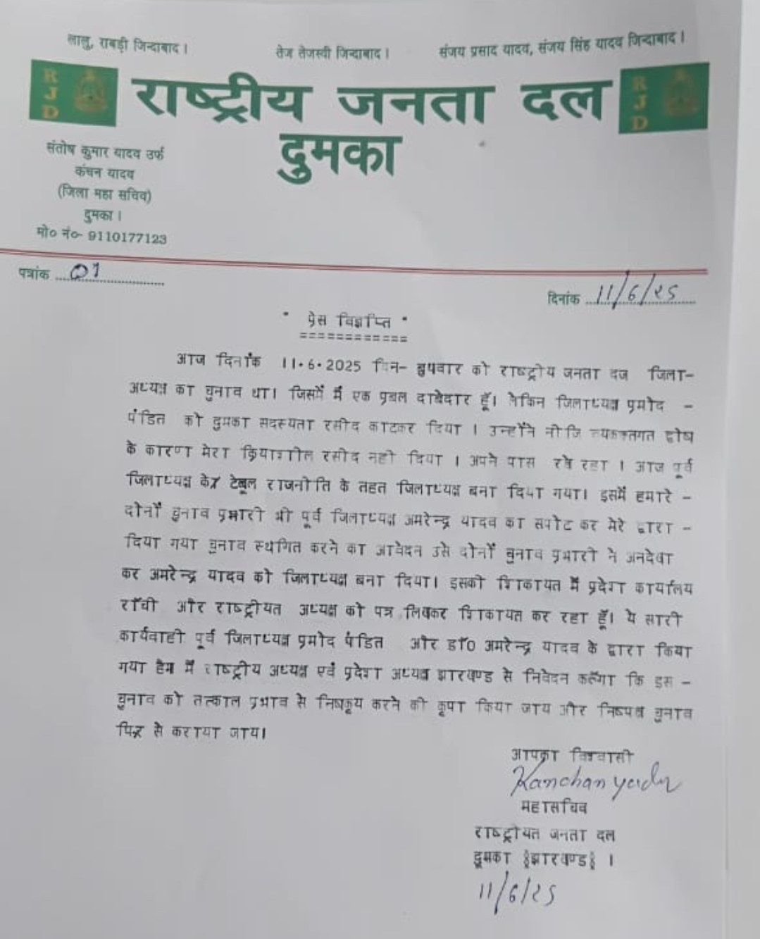 दुमका:राष्ट्रीय जनता दल दुमका के महासचिव संतोष कुमार यादव उर्फ कंचन यादव ने प्रेस विज्ञप्ति जारी कर कहा की राष्ट्रीय जनता दल जिला-अध्यक्ष का चुनाव में मैं एक प्रबल दावेदार हूँ। लेकिन जिलाध्यक्ष प्रमोद...