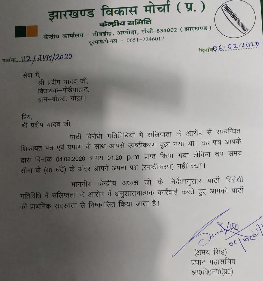 रांची : झारखंड विकास मोर्चा के सुप्रीमो बाबूलाल मरांडी विधायक प्रदीप यादव पर कार्रवाई कर सकते है. झाविमो पार्टी ने उनसे 48 घंटे के अंदर स्पष्टीकरण मांगा है. यंहा बता दे की पार्टी महासचिव अभय सिंह ने ए...