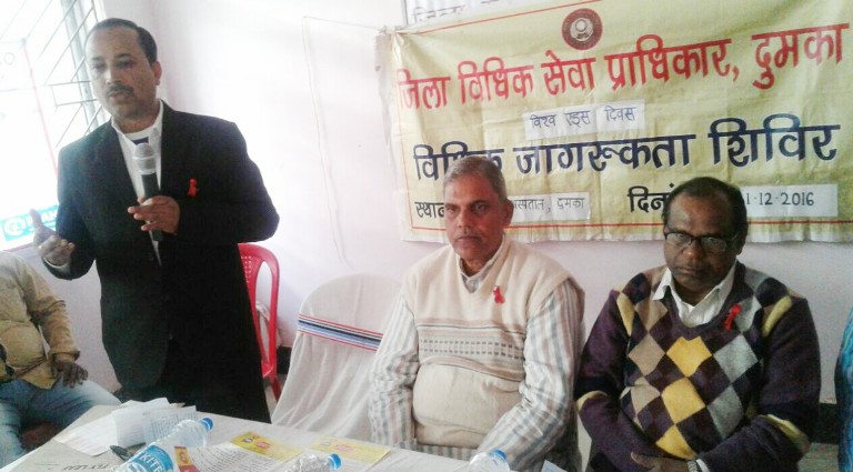 दुमका । विश्व एड्स दिवस के उपलक्ष्य पर जिला विधिक सेवा प्राधिकार द्वारा दुमका सदर अस्पताल मे विधिक जागरुकता शिविर का आयोजन किया गया। शिविर का विधिवत उद्घाटन दुमका के सिविल सर्जन विनोद कुमार साहा, स्था...