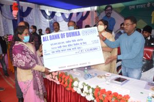 दुमका :राज्य सरकार के गठन के एक वर्ष पूर्ण होने के उपलक्ष्य पर सदर प्रखंड दुमका में विकास उत्सव मनाया गया। इस दौरान विधायक बसंत सोरेन के कर कमलों द्वारा योजनाओं का शिलान्यास, उद्घाटन, पेंशन, पारिवारिक लाभ, मनरेगा किट, प्रोत्साहन राशि, जेएसएलपीएस का परिसम्पत्ति वितरण किया गया। विधायक बसंत सोरेन ने हरी झंडी दिखाकर श्यामा प्रसाद मुखर्जी रूर्बन मिशन अंतर्गत 28 सोलर पंप के अधिष्ठापन का शुभारंभ किया। जिसकी सन्निहित राशि 83,72000 रुपये है। 225 स्ट्रीट लाइट,15 पीसीसी पथ, 6 आंगनबाड़ी केंद्रों, 4 सामुदायिक शौचालयों का शिलान्यास किया गया। जिसकी सन्निहित राशि लगभग 2 करोड़ रुपए हैं।विकास उत्सव में लाभार्थियों के बीच परिसम्पत्तियों का वितरण- पेंशन-174, पारिवारिक लाभ-25, मनरेगा किट-100,आवास स्वीकृति-10,कालाजार मरीजों को प्रोत्साहन राशि-2, जेएसएलपीएस का लगभग ढाई करोड़ का परिसम्पत्तियों का वितरण किया गया। इस दौरान 8 पोषण सखी का भी चयन किया गया।