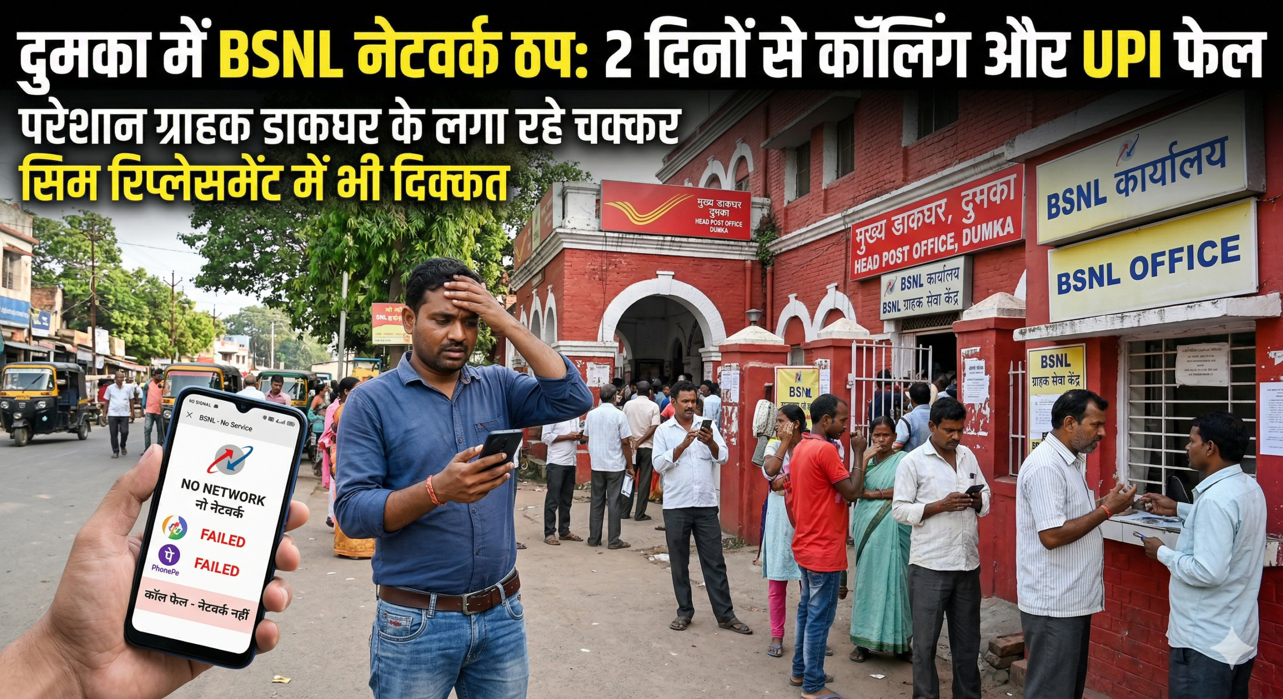 दुमका: डिजिटल इंडिया के इस दौर में दुमका शहर के BSNL (भारत संचार निगम लिमिटेड) उपभोक्ता भारी परेशानी का सामना कर रहे हैं। पिछले दो दिनों से शहर में BSNL का नेटवर्क पूरी तरह से चरमरा गया है, जिससे प्रीपेड और पोस्टपेड दोनों तरह के ग्राहकों की मुश्किलें बढ़ गई हैं।